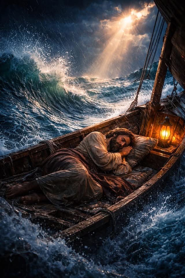 Jesus, der im Boot schläft, ist dieselbe Erklärung in menschlicher Form. Er ist dem Sturm gegenüber nicht gleichgültig. Er lässt sich davon nicht beeindrucken. Das Chaos bedroht ihn nicht, weil er nicht auf die Umstände reagiert. Er herrscht über sie. Sein Schlaf ist keine Ignoranz. Es ist Zuversicht. Er ruht sich aus, weil nichts passiert, was nicht bereits seiner Autorität unterliegt.
