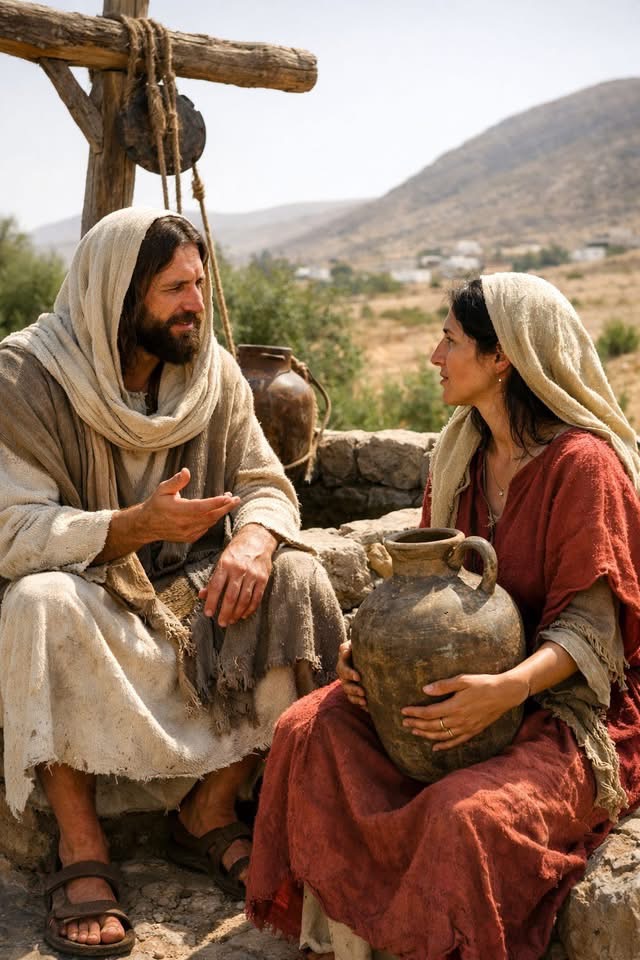 Mittags, als die Sonne hoch stand und die Straßen leer waren, ging eine Frau allein zum Brunnen. Sie wählte diese Zeit absichtlich – um dem Getuschel, den Blicken und der Scham zu entgehen. Sie trug ihren Krug, aber sie trug auch ihre Vergangenheit mit sich.