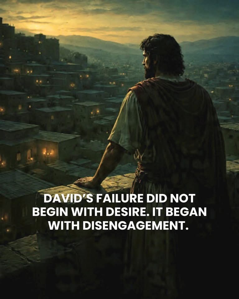 David’s failure did not begin with desire. It began with disengagement. He was still king, but he had stepped out of the rhythm God had set for him. In earlier seasons, when danger surrounded him, David depended on God daily. He resisted temptation even when it came close. Now, with peace around him, his guard slowly dropped.