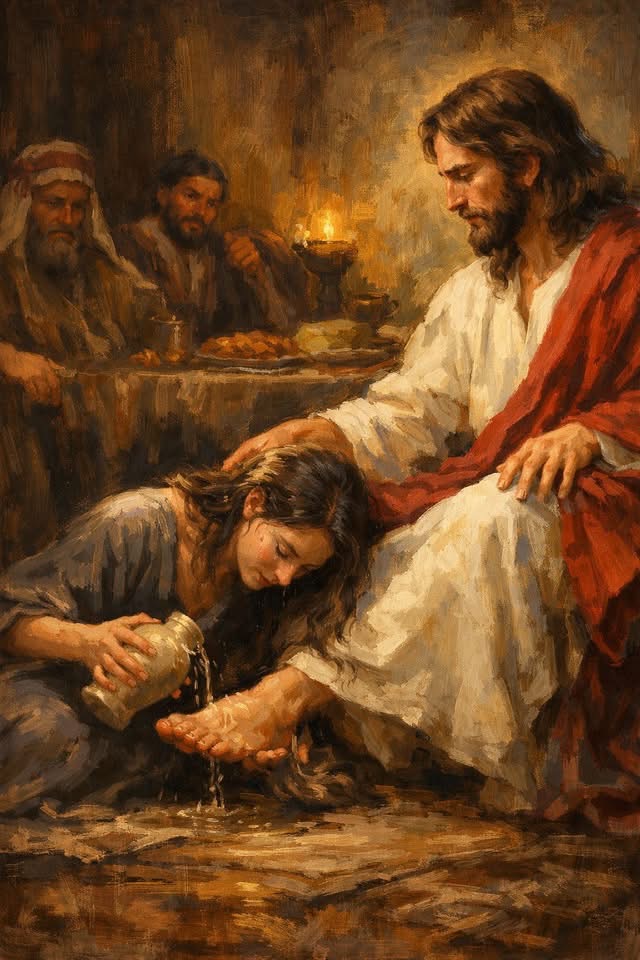 In Lukas Kapitel 7 begegnen wir einer Frau, die nicht durch ihren Namen, sondern durch ihre Vergangenheit bekannt ist. Sie betritt das Haus eines Pharisäers, wo Jesus sitzt, und trägt ein Alabastergefäß mit Parfüm bei sich. Sie spricht nicht. Sie kniet nieder. Ihre Tränen fallen auf die Füße Jesu, und voller Demut wischt sie sie mit ihren Haaren ab und gießt das Parfüm aus.