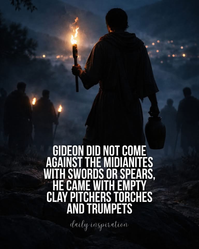 Die Geschichte wird noch überraschender, wenn wir uns ansehen, was Gideon und seine Männer tatsächlich in die Schlacht mitnahmen. Sie marschierten nicht mit erhobenen Schwertern oder glänzenden Rüstungen. Stattdessen hatten sie Trompeten, leere Tongefäße und Fackeln dabei, die in den Gefäßen versteckt waren.