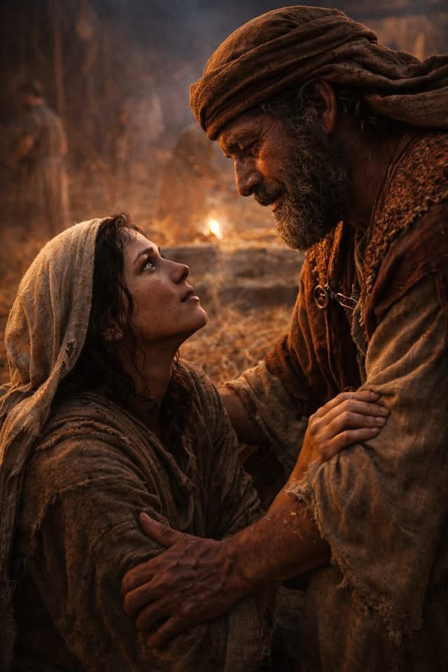 In diesem schwach beleuchteten Haus bat Saul die Frau, den Geist des Propheten Samuel zu beschwören. Und als die Gestalt erschien, war die Botschaft kein Trost – es war ein Urteil. Samuels Worte waren erschreckend: Weil Saul dem Herrn ungehorsam gewesen war, würde ihm das Königreich entrissen werden, und am nächsten Tag würden er und seine Söhne in der Schlacht fallen.