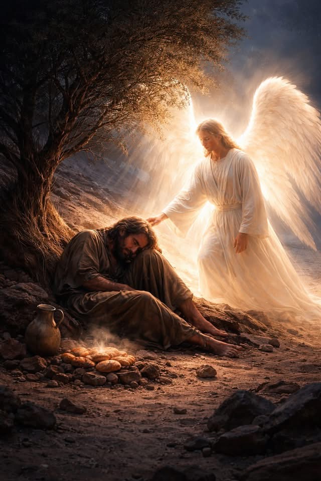 Während Elia schlief, berührte ihn ein Engel und sagte: „Steh auf und iss.“ Neben ihm lag Brot, das über heißen Kohlen gebacken worden war, und ein Krug mit Wasser. Der Himmel gab ihm inmitten seiner Erschöpfung Kraft. Die Gnade begegnete ihm im Staub.