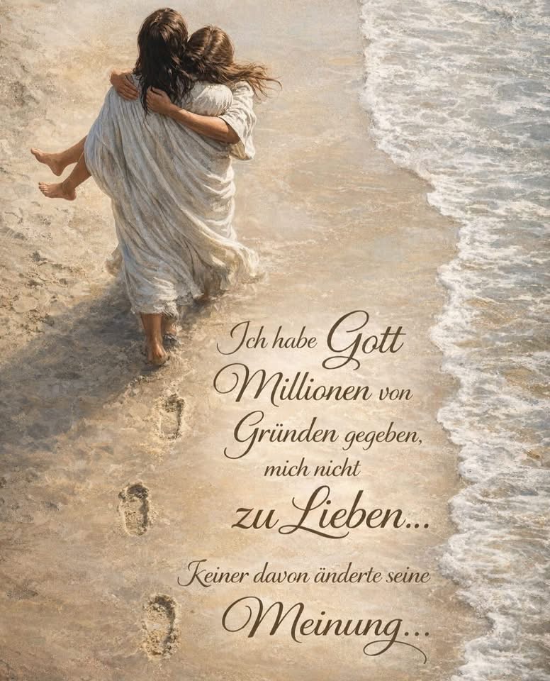 Wenn ich nicht mehr kann, trägt Er mich, wie auf diesem Bild am Strand, wenn meine Spuren im Sand plötzlich verschwinden, weil Er mich trägt.