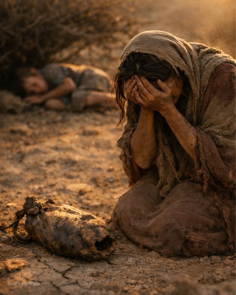 Hagar legt ihren Sohn unter einen Busch, weil sie es nicht ertragen kann, ihn sterben zu sehen. Sie geht gerade so weit weg, dass sie seine letzten Atemzüge nicht hören kann, aber nah genug, dass sie mit ihm sterben wird. Sie bricht im Staub zusammen und weint. Schau sie dir einen Moment lang an. Sieh, wie sie sich in tiefe Qualen gezwängt hat.