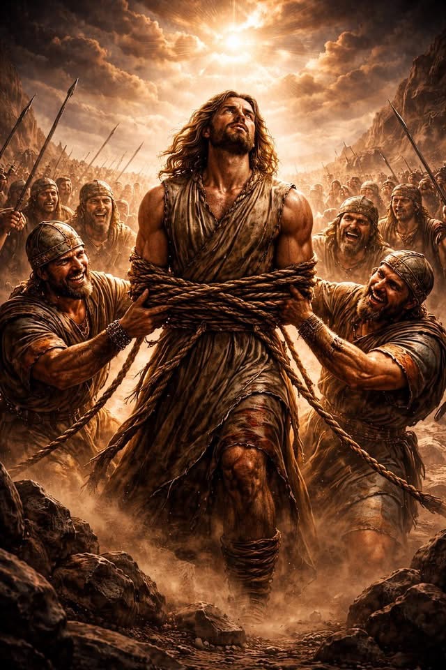 Dies ist nicht nur eine Geschichte über rohe Kraft. Es ist ein Schatten. Simson, der Befreier, ließ sich bereitwillig fesseln und ausliefern. Er stand gefesselt da, während der Feind feierte. Es sah nach einer Niederlage aus. Es sah nach Kapitulation aus. Aber die Fesselung war nicht das Ende der Geschichte. Als der Geist des Herrn über ihn kam, fielen die Seile wie verbranntes Flachs von ihm ab. Was sicher schien, konnte ihn nicht halten. Was wie Schwäche aussah, wurde zum Tor zum Sieg. Er besiegte die Unterdrücker und brachte seinem Volk die Freiheit.