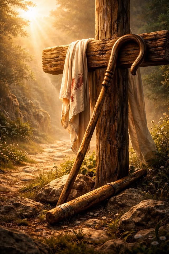 Gleichzeitig fungiert das Kreuz als Stab. Die Menschheit war vom Weg abgekommen. Wir waren in eine Grube gefallen, aus der wir nicht mehr herausklettern konnten. Wir wurden nicht durch Anweisungen oder Anstrengungen gerettet, sondern durch Gnade herausgezogen. Jesus steht nicht über der Grube und ruft Anweisungen. Er steigt hinein. Er hebt uns heraus, indem er unser Gewicht selbst trägt. „Als wir noch Sünder waren, ist Christus für uns gestorben“ (Römer 5,8, ESV).
